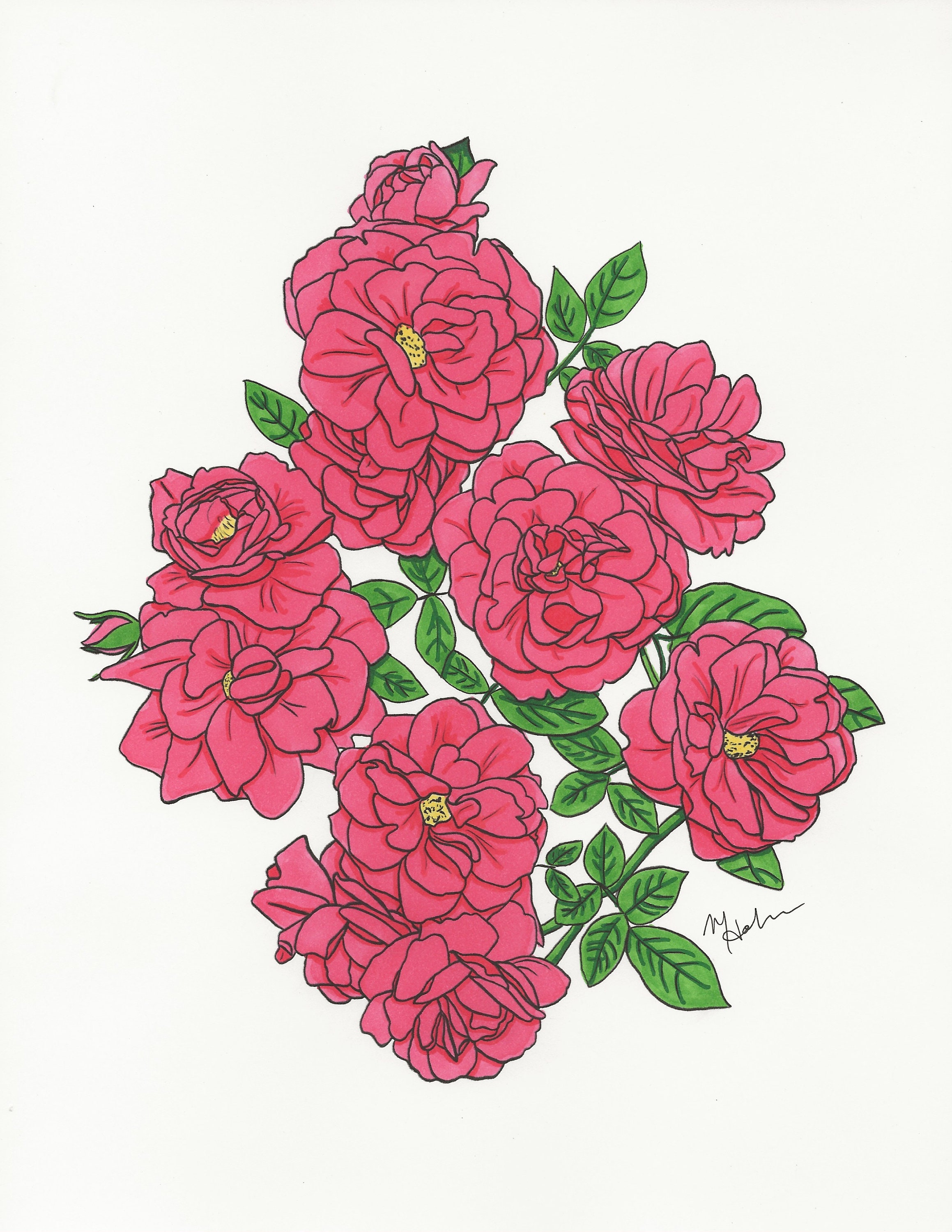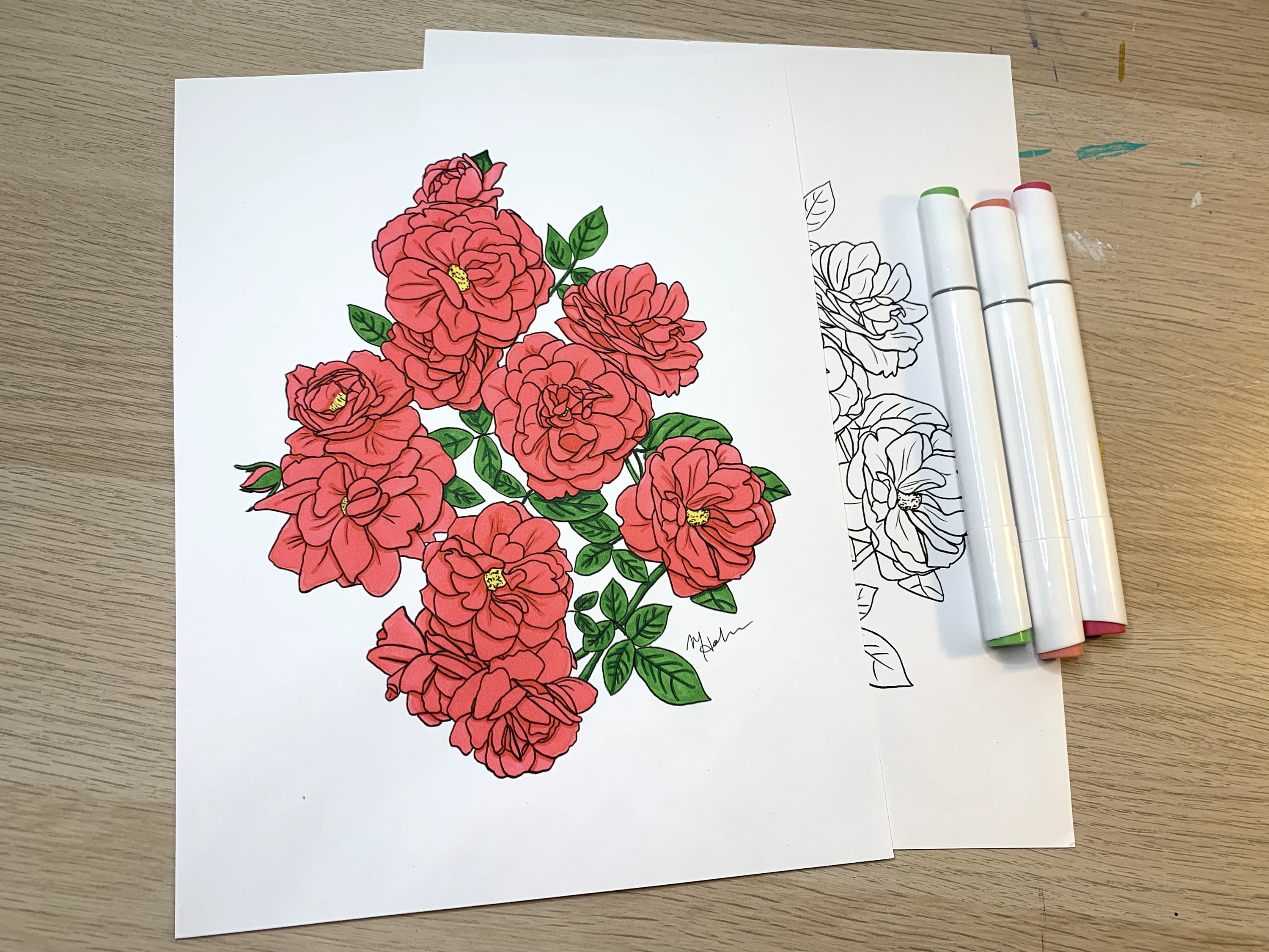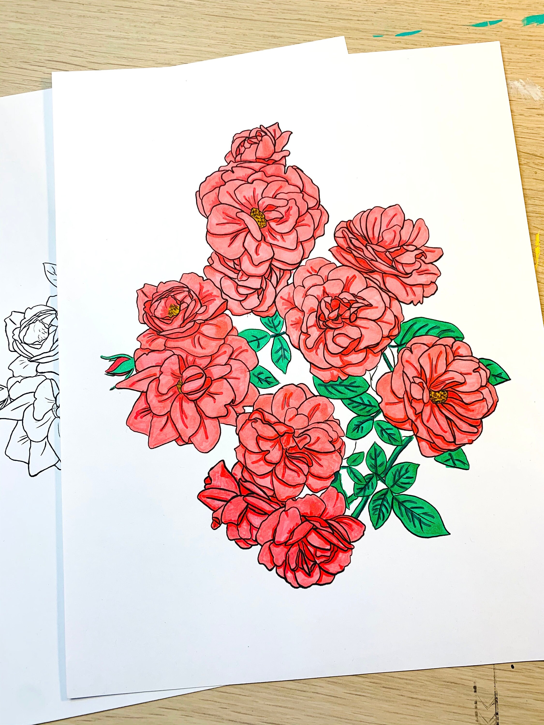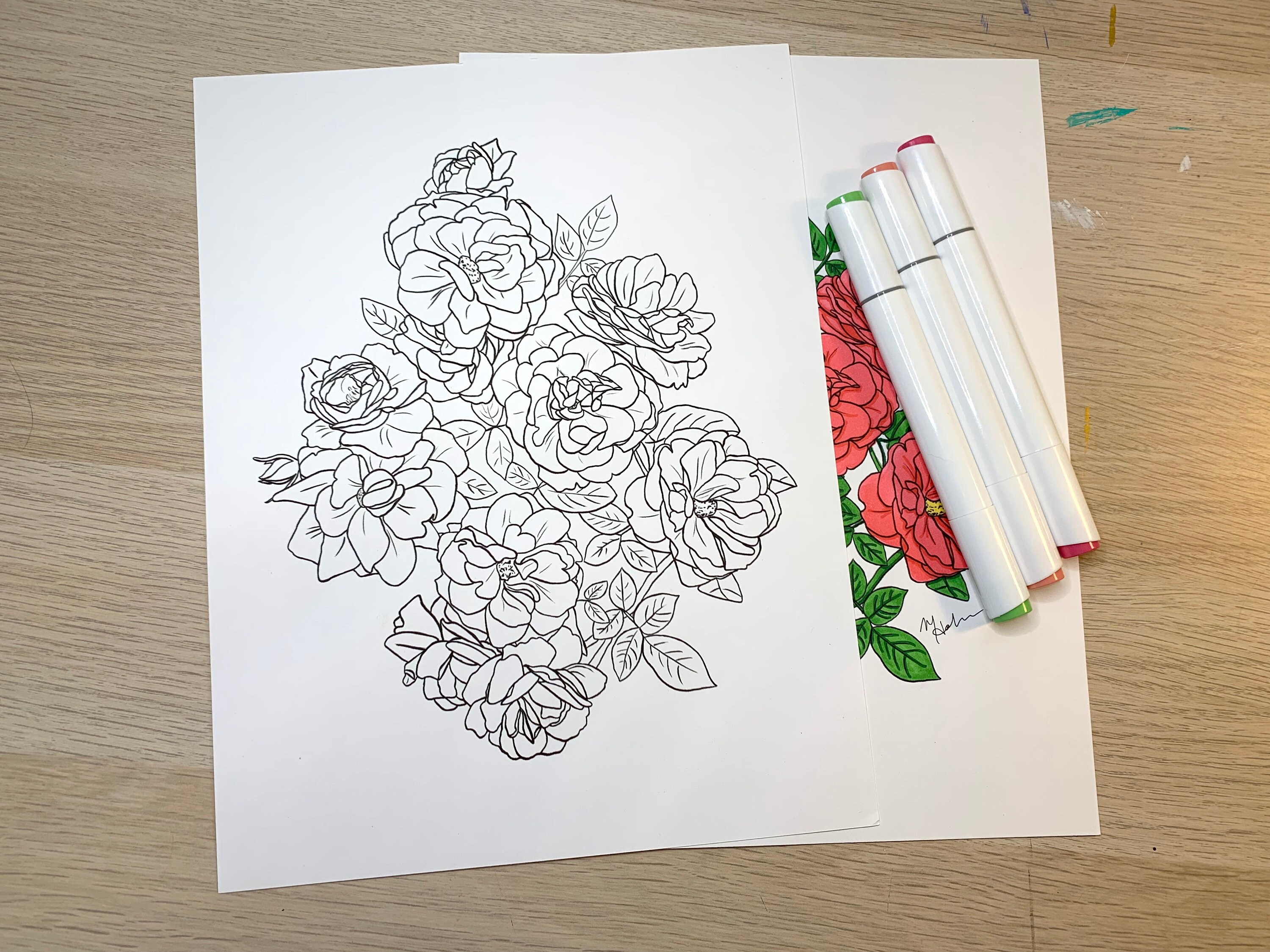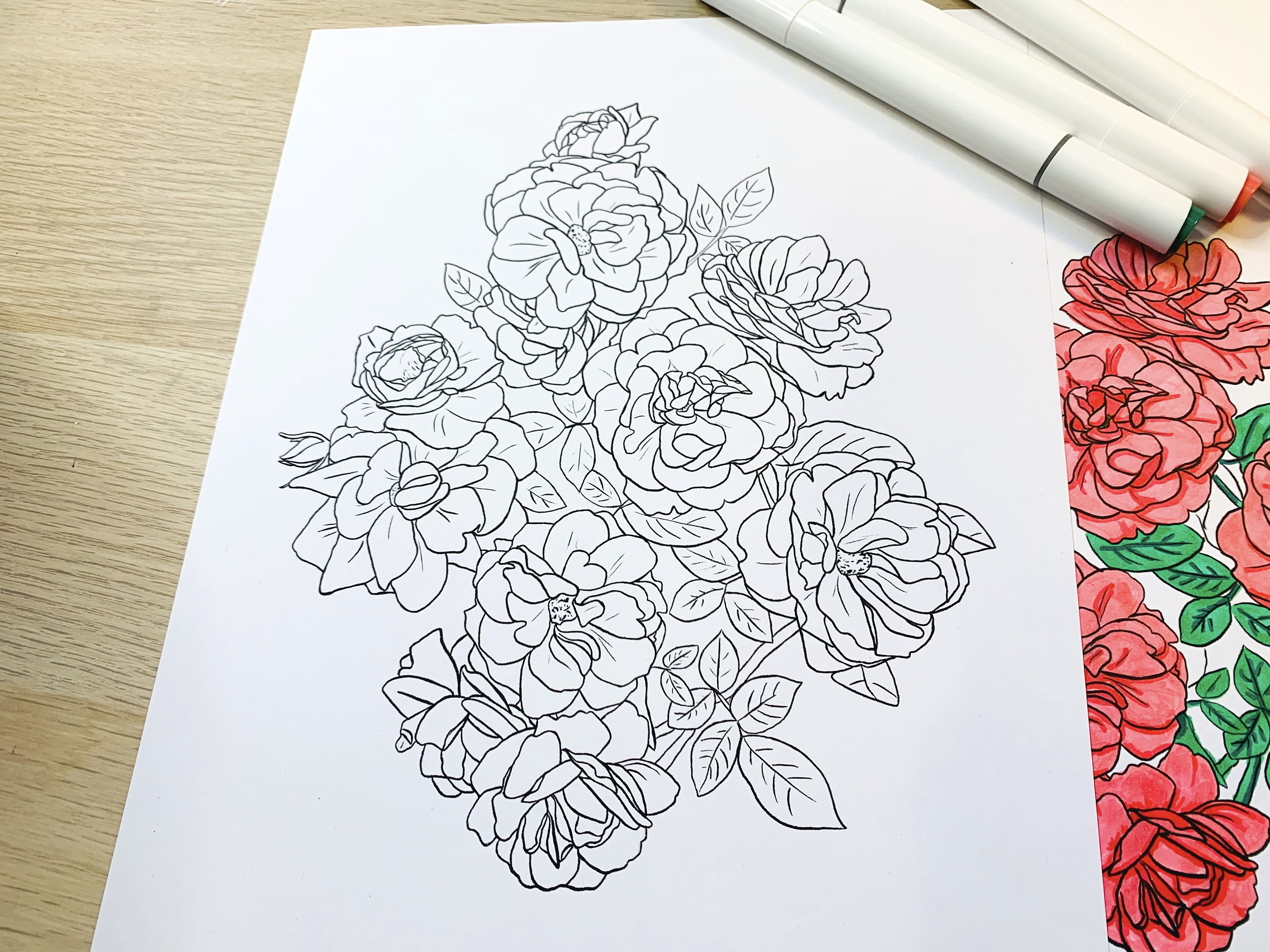 Coloring Page for kids and adults, floral rose plant, digital download pdf or jpeg