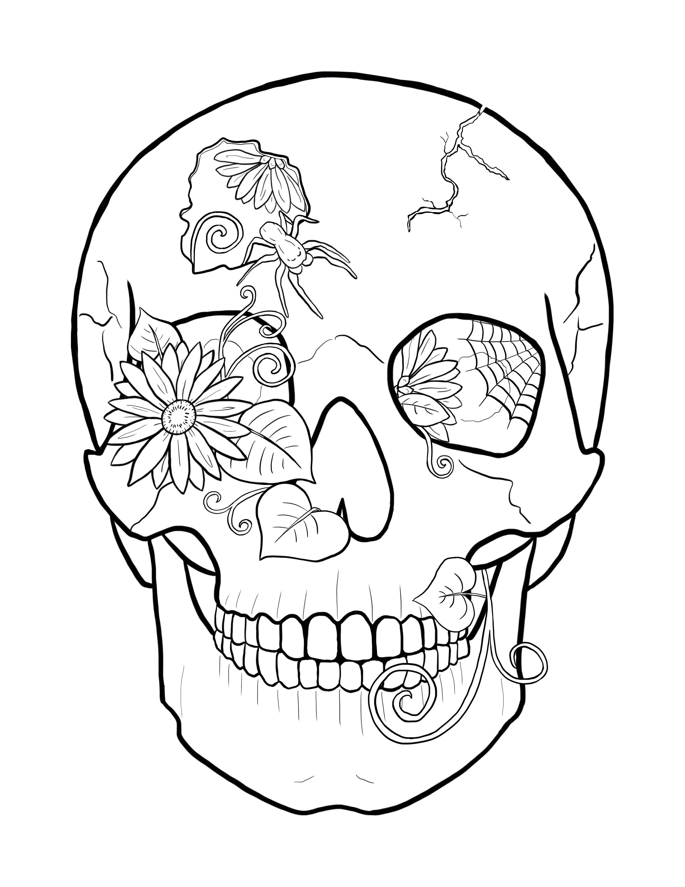Coloring Page Digital Download Printable, Halloween Skull Creepy Spider